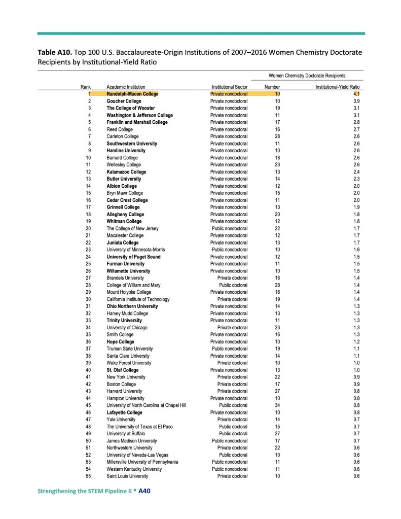 - The Randolph-Macon Chemistry Department ranks #1 for Women Chemistry Doctorate Recipients (2007-2016)
